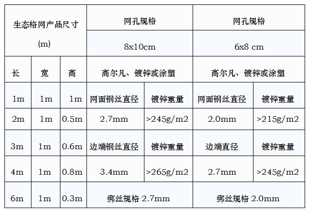 生态格网尺寸: 2*1*1米、3*1*1米、4*1*1米、 2*1.5*1米、4*1.5*1米、 2*1*0.5米、4*1*0.5米、 3*2*0.3米、4*2*0.3米、5*2*0.3米、6*2*0.3米