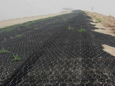 河道路基边坡快速植生双绞合钢丝网垫是由金属双绞合六角网与热融化的聚丙烯原材料由机器压合而成的土工合成材料,双绞合金属网的孔格为6cm*8cm/8cm*10cm,聚丙烯粘合后塑料丝之间的空隙不小于90%,聚丙烯压合后加筋麦克垫的厚度不小于12mm,这样加筋麦克垫就为播撒草种提供了充足的空间,可以保证植草不会被雨水冲走、被风刮走,这也就是我们所说的三维快速植生网垫。 |
