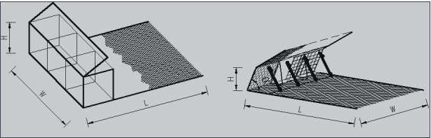 3.13网垫 revet-mattress (RM)尺寸(L和W)大而厚度(H)小(厚度≤30cm),并配有标称间距1m的中间隔板和独立盖板,采用绑扎钢丝或C型钉等方法连接而成的组合体。盖板可以采用同等长宽的网面或卷网(见图5)